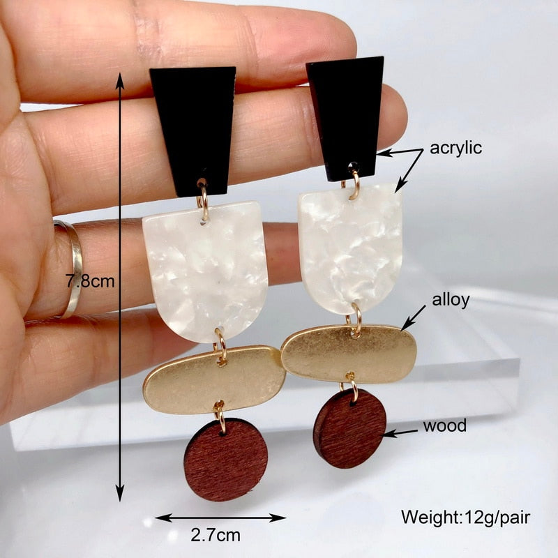 - These Fashion Acrylic Wood Alloy Long Dangle Earrings are suitable for both casual and dressy occasions. Whether you're heading to a brunch with friends or a special event, these earrings add a trendy and chic element to your outfit.